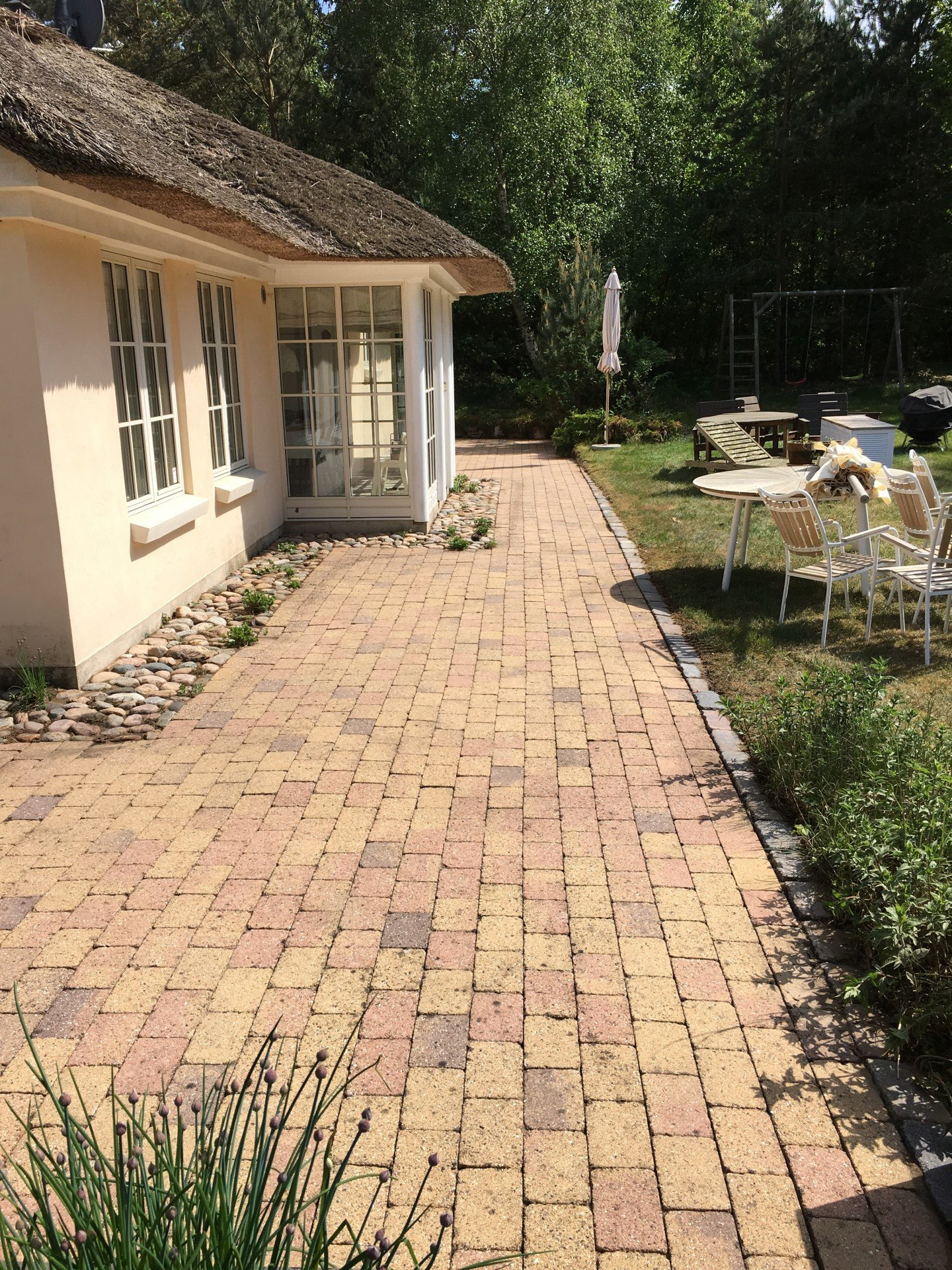 Haveflisegang og terrasse i teglsten. Udlagt gennem have med terrassen i bunden af haven.